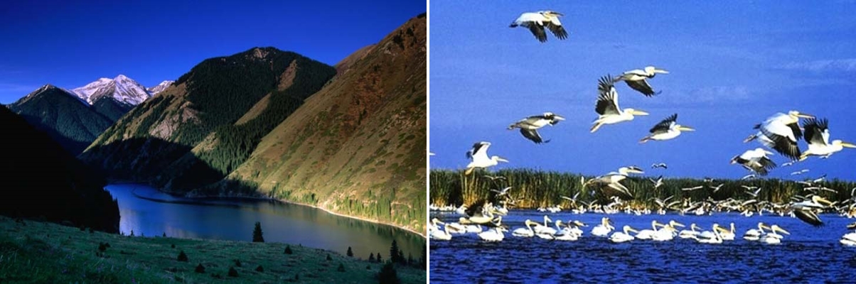 자연환경 중앙아시아의 초원지대에 위치한 내륙국으로 북단은 모스크바, 남단은 한반도의 북부와 대략 같은 위도이다. 국토의 대부분은 평원으로 되어 있으나, 서부는 카스피해 연안저지와 투란저지, 중앙부는 카자흐 소화산대지, 북부는 서시베리아 저지로 되어 있다. 동부와 남부 산악지대는 만년설과 빙하로 덮인 해발 5000m가 넘는 톈산, 알타이 양 산맥이 솟아 있다. 그래서 동고서저형의 지세를 이룬다. 전체 면적 중 경작 가능지가 8.28%, 농경지가 0.05%, 기타가 91.67% (2005년)이다. 호소(湖沼)로는 서쪽의 카스피해와 그 동쪽의 아랄해, 그리고 중국과의 국경에 발하슈호(湖)가 있는데 모두 염호이다. 주요 하천으로는 이르티시, 우랄, 시르다리야, 추, 일리 등이 이들 호소로 유입하며, 오비강(江) 유역의 북부 일부를 제외하면 내륙에 광대한 유역 평야을 형성한다. |